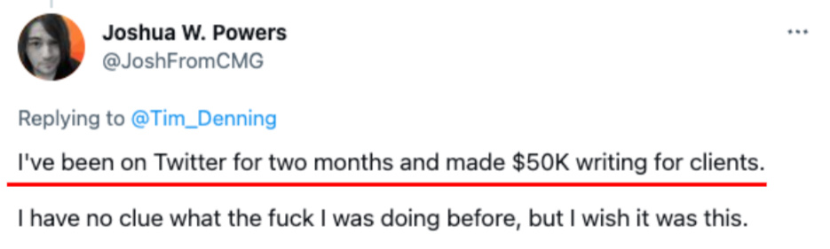 Dan Koe, CEO of Kortex, prolific online writer. $4.5M in revenueIf you're anything like me, you noticed Tim on Medium a while ago and have been following him ever since.Tim completely changed the way that I write.Tim helped me synthesize my ideas into something unique. And I would argue that that led to the uniqueness that my brand has today and a lot of the success around the ideas that stick in my readers minds.So if you're considering learning from Tim, do it. Please do it. He is the most prolific writer I've ever seen in my life.
